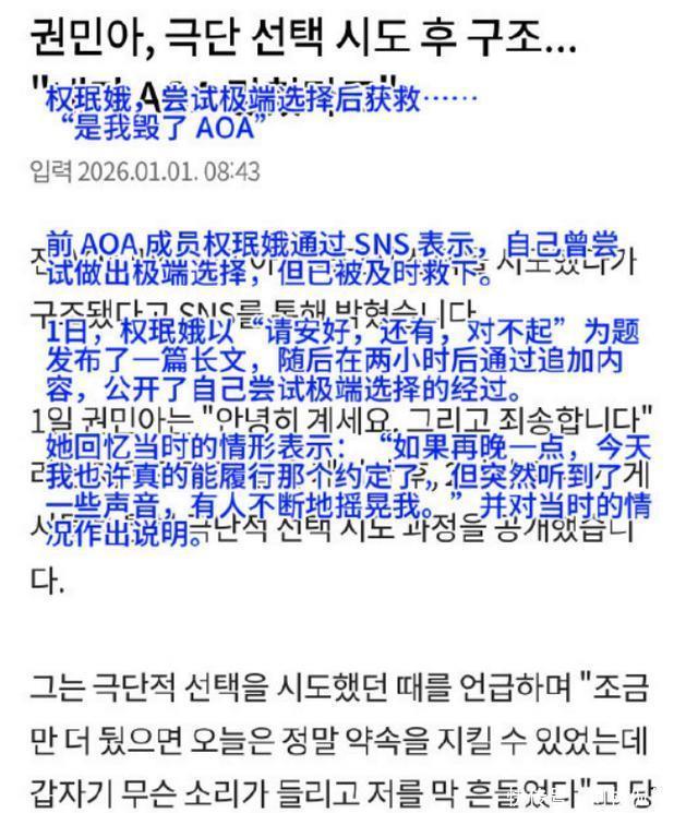 2026年伊始,韩国娱乐圈便被一声沉重的叹息笼罩。AOA前成员权珉娥再次站在了生死的边缘,这是她自2020年以来第六次试图通过极端方式结束生命。所幸工作人员发现及时,将她从鬼门关拉了回来。获救后,她并未选择沉默,而是带着满身的伤痕与愤怒,向这个世界发出了最刺耳的控诉。